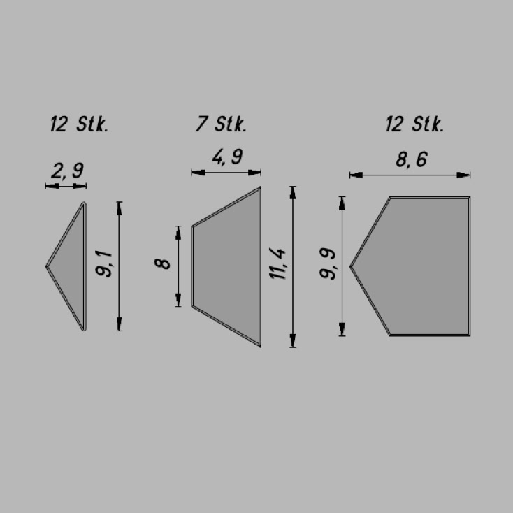 Menge: 33 Stück pro Packung (7 Halbplatten, 12 Kantenplatten, 12 Keile)
