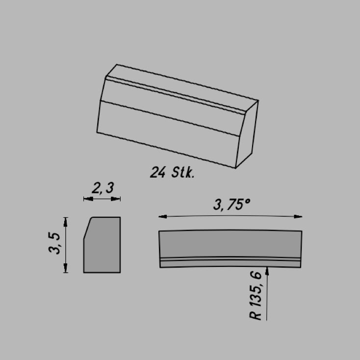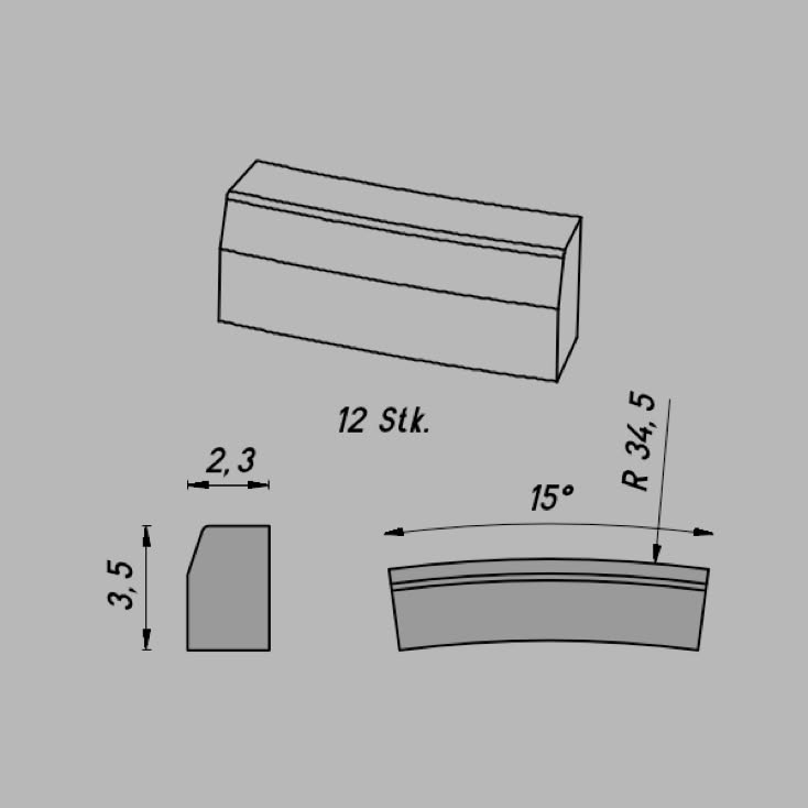 • Abmessungen: R 34,5/15º x 3,5 x 2,3 mm