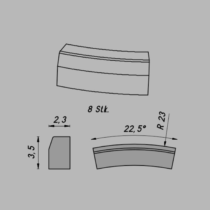 • Abmessungen: R 20,7/22,5º x 3,5 x 2,3 mm