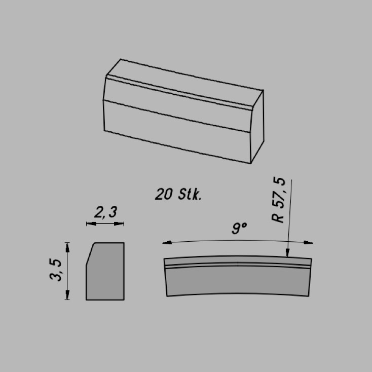 • Abmessungen: R 57,5/9º x 3,5 x 2,3 mm