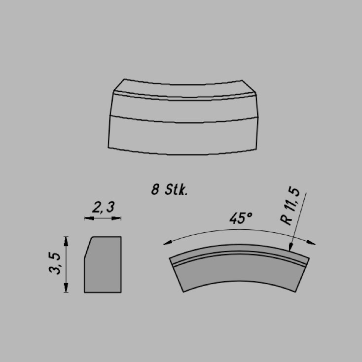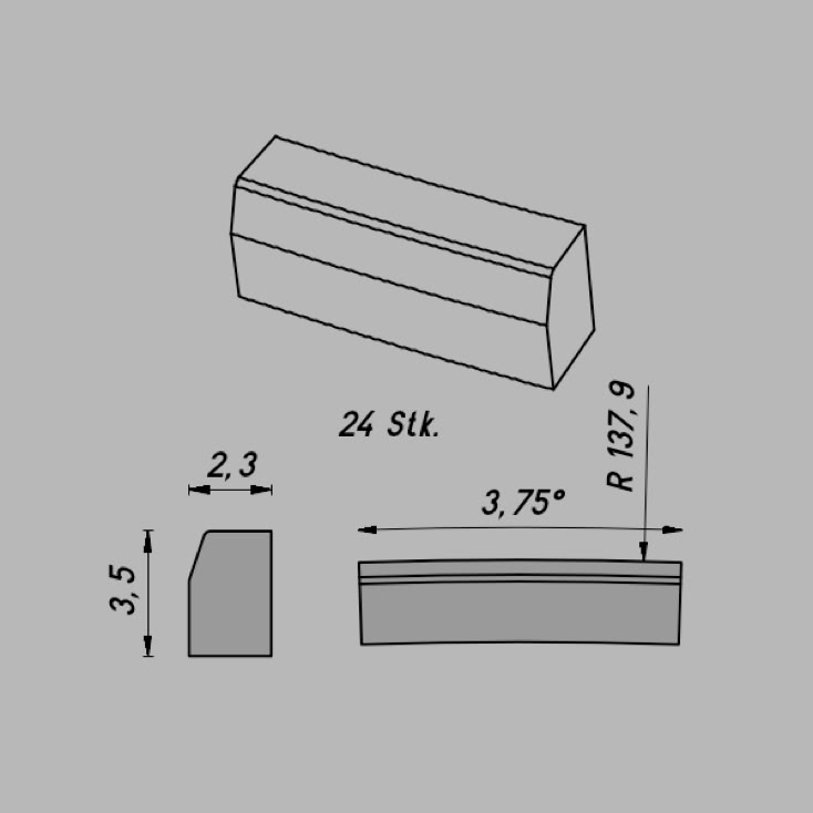 • Abmessungen: R 137,9/3,75º x 3,5 x 2,3 mm