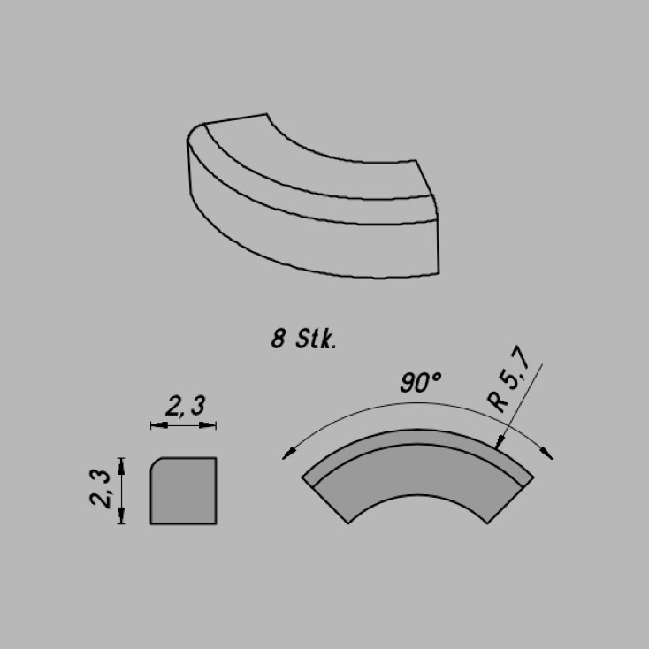 • Abmessungen: R 137,9/3,75º x 3,5 x 2,3 mm