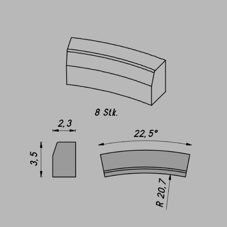 • Abmessungen: R 20,7/22,5º x 3,5 x 2,3 mm