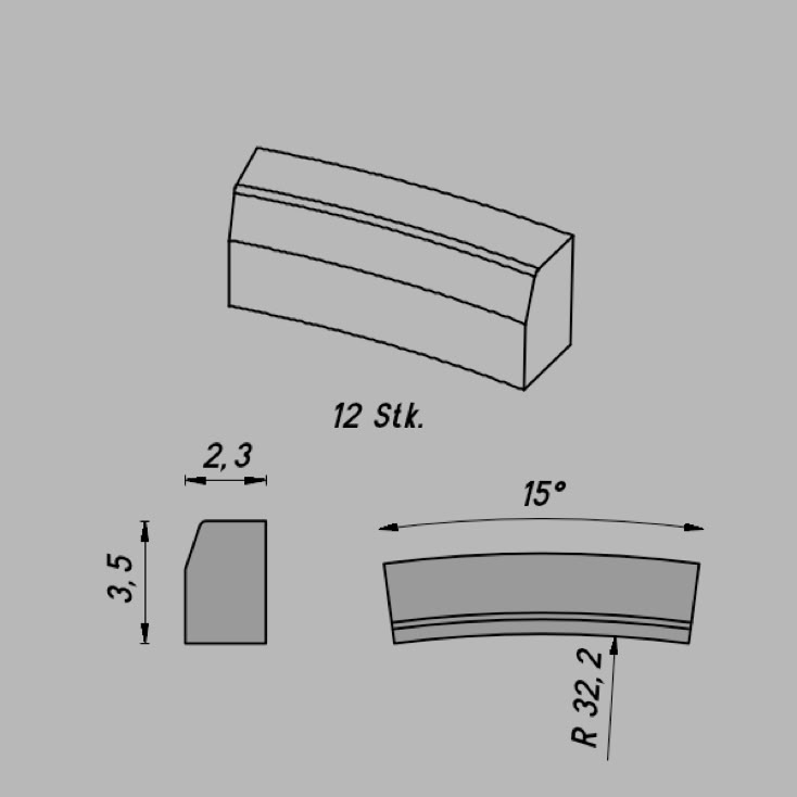 • Abmessungen: R 34,5/15º x 3,5 x 2,3 mm