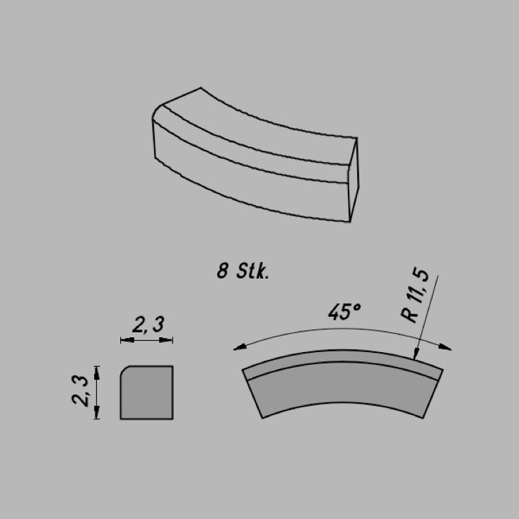 • Abmessungen: R 23/22,5º x 3,5 x 2,3 mm