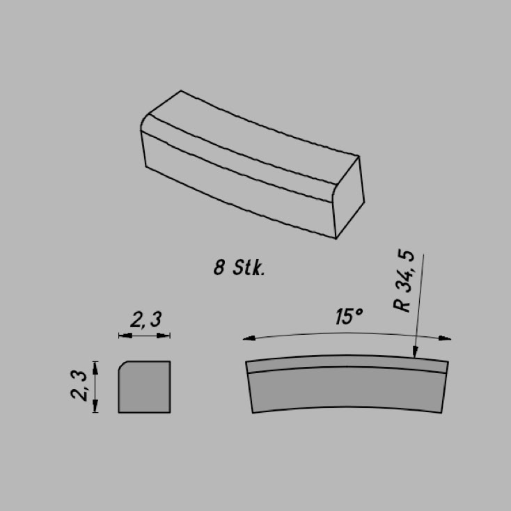 • Abmessungen: R 34,5/15º x 2,3 x 2,3 mm