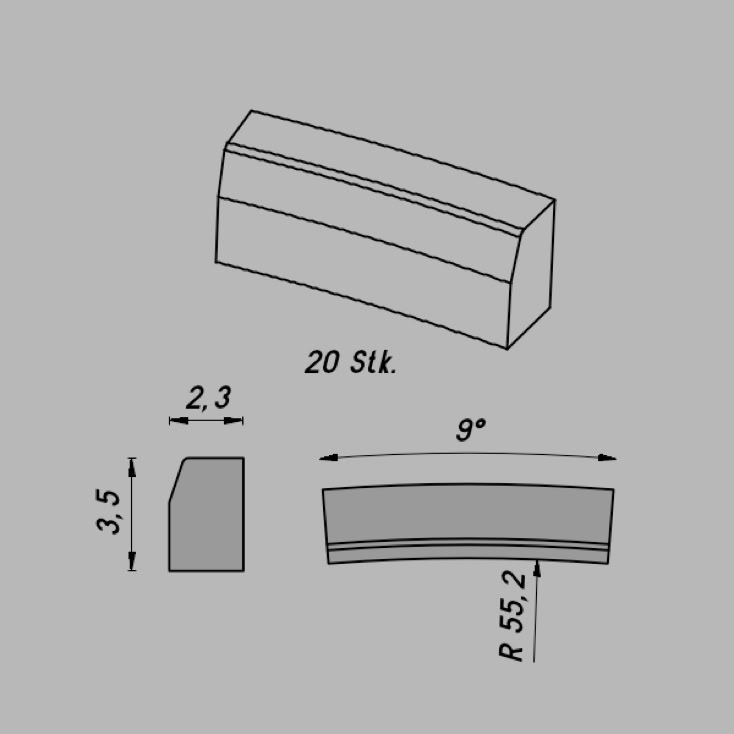 • Abmessungen: R 55,2/9º x 3,5 x 2,3 mm