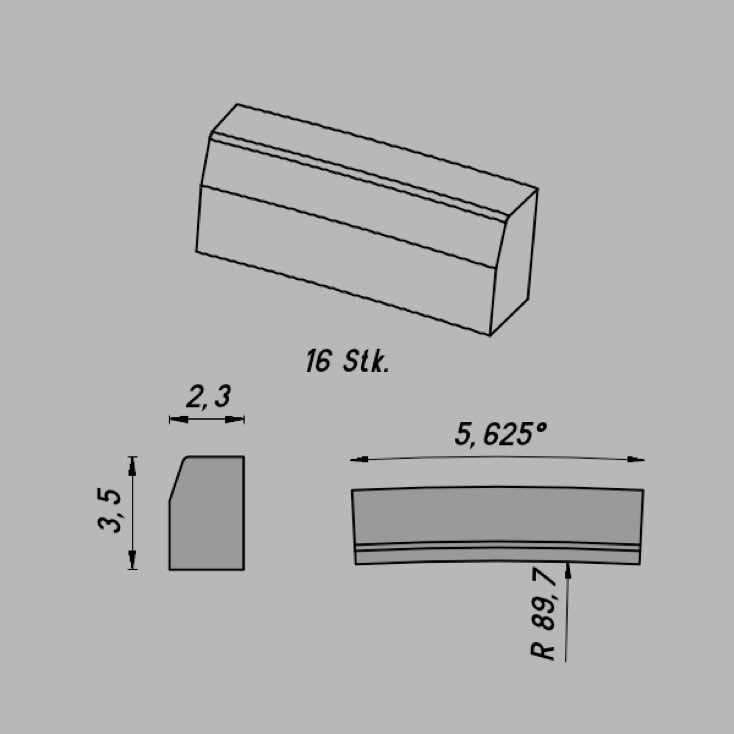 • Abmessungen: R 89,7/5,625º x 3,5 x 2,3 mm