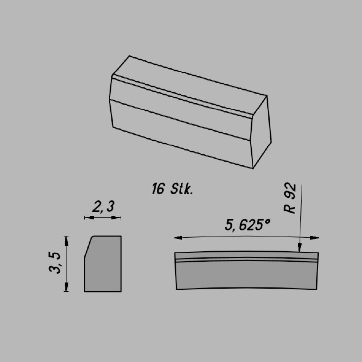 • Abmessungen: R 92/5,625º x 3,5 x 2,3 mm