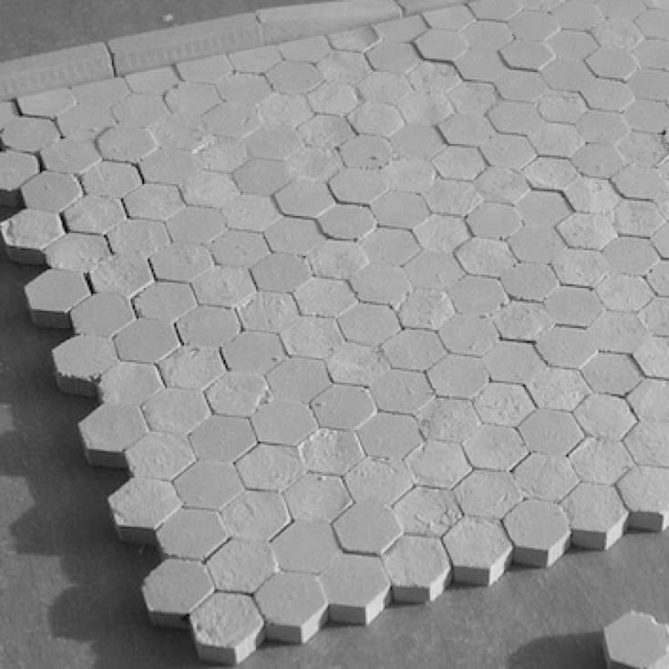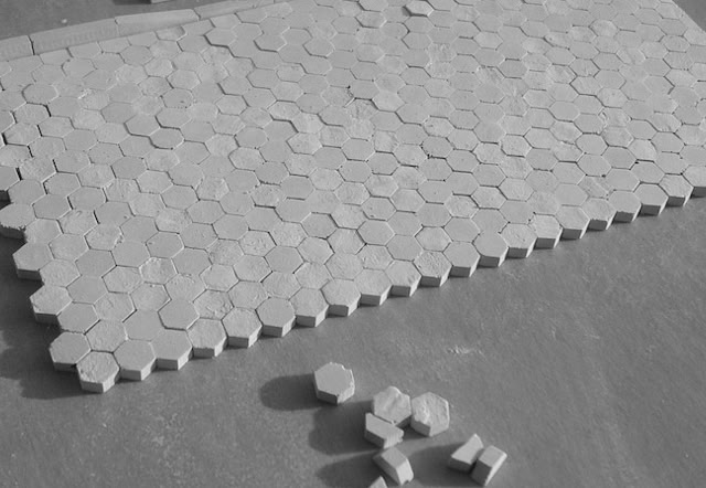 Unsere handgefertigte Sechskantplatten im Massstab 1:87 bestehen aus hochwertigem, gefärbtem Gips und sind den echten Platten detailgetreu nachgebildet.