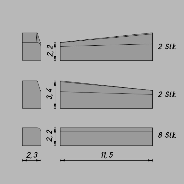 Unsere handgefertigten Bordsteine bestehen aus hochwertigem, gefärbtem Gips und sind den echten Strassenbordsteinen detailgetreu nachgebildet. Erhältlich als Hochbordsteine, Rundbordsteine (Absenker) sowie schräg ausgeformte Übergangssteine zur sanften Höhenreduzierung.