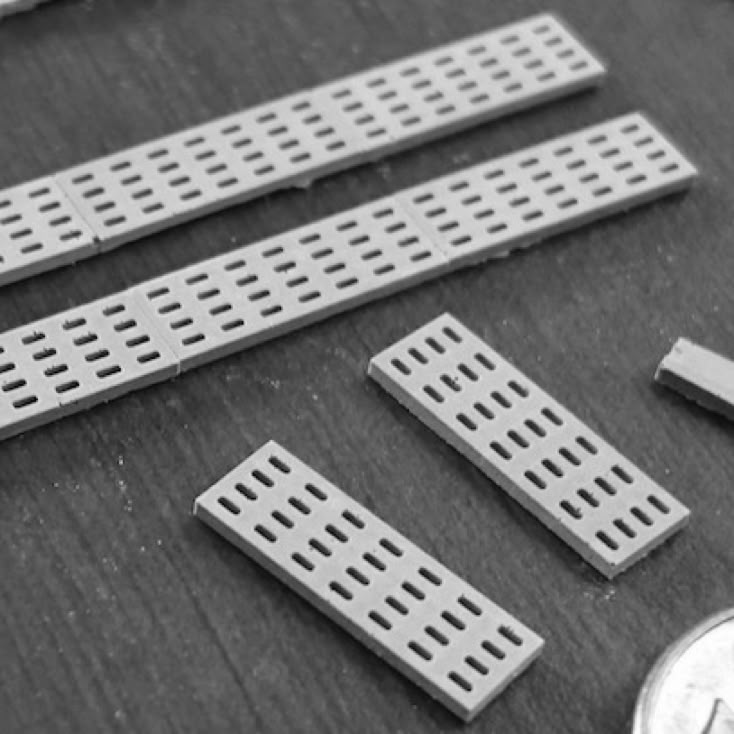 Unsere handgefertigten Betonplatten des Kolonnenwegs im Massstab 1:220 bestehen aus hochwertigem, gefärbtem Modellbaugips und sind den charakteristischen Betonplatten mit Öffnungen detailgetreu nachempfunden, wie sie in der ehemaligen DDR verwendet wurden.